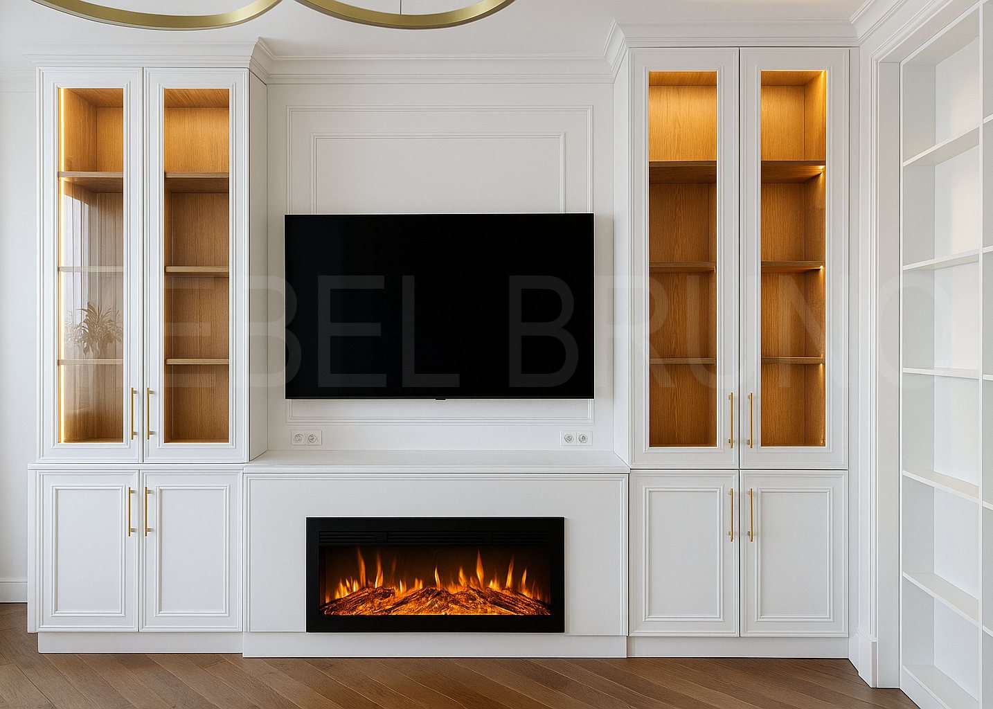 Элегантная каминная композиция с ТВ-зоной — готовая работа, где каждая деталь работает на статус и уют. Светлая эмаль, золотые акценты и витрины с подсветкой дают ощущение “дорогого” интерьера без перегруза. Закрытые секции берут на себя хранение, а открытые ниши подчёркивают декор и создают мягкий свет. Такой проект всегда делаем под помещение: размеры, привязки, электрику и сценарии подсветки продумываем заранее.