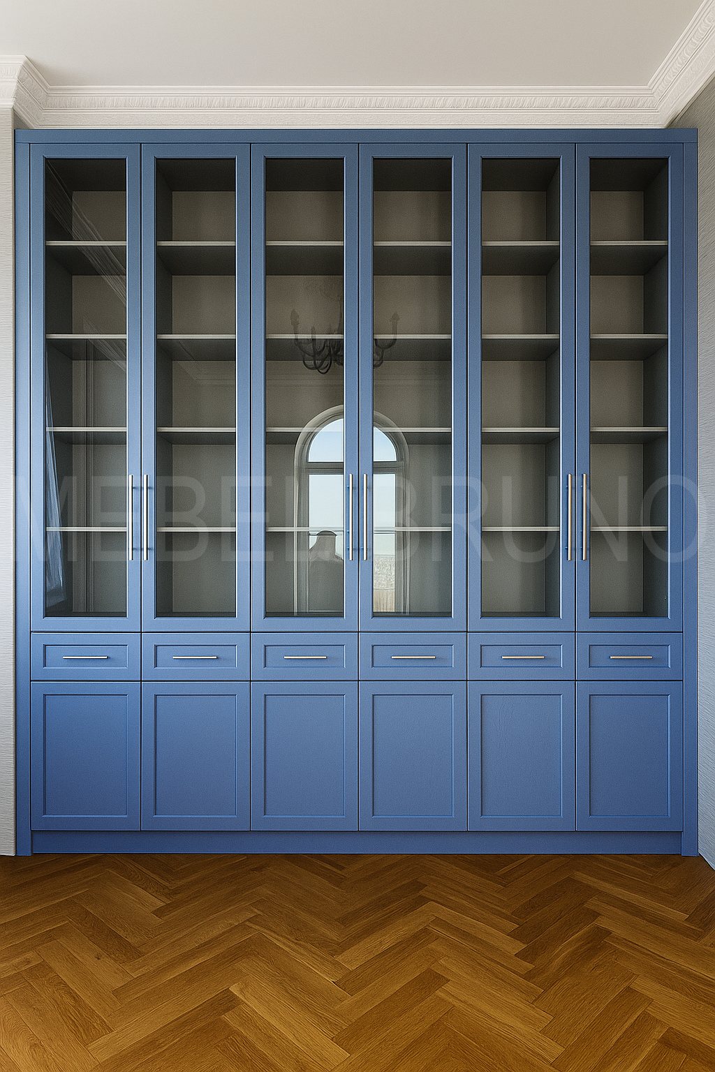 Этот проект — про смелый цвет и идеальную систему хранения. Синий шкаф-витрина во всю стену сразу становится акцентом комнаты, а стеклянные фасады визуально “облегчают” большую композицию. Нижние секции и ящики закрывают всё бытовое, оставляя на виду только то, что хочется показать. Выполнили по индивидуальным размерам, чтобы мебель встала точно в помещение и выглядела как часть архитектуры интерьера.