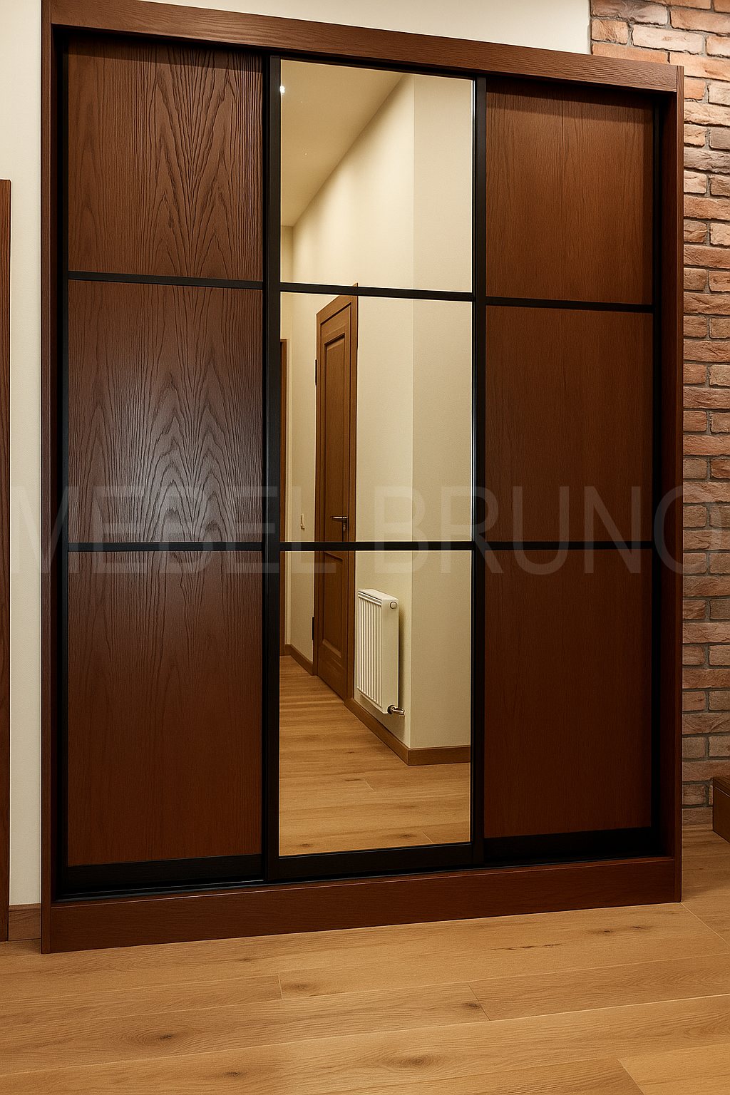 Этот шкаф-купе — пример современного “чистого” дизайна, где всё решают пропорции и детали. Центральное зеркало визуально расширяет пространство, а чёрная раскладка добавляет графику и делает фасад выразительным, как интерьерная перегородка. Тёплая древесная фактура балансирует строгость линий и создаёт уют. Проект выполнен по индивидуальным размерам — так, чтобы шкаф идеально встал в помещение и выглядел как часть архитектуры.