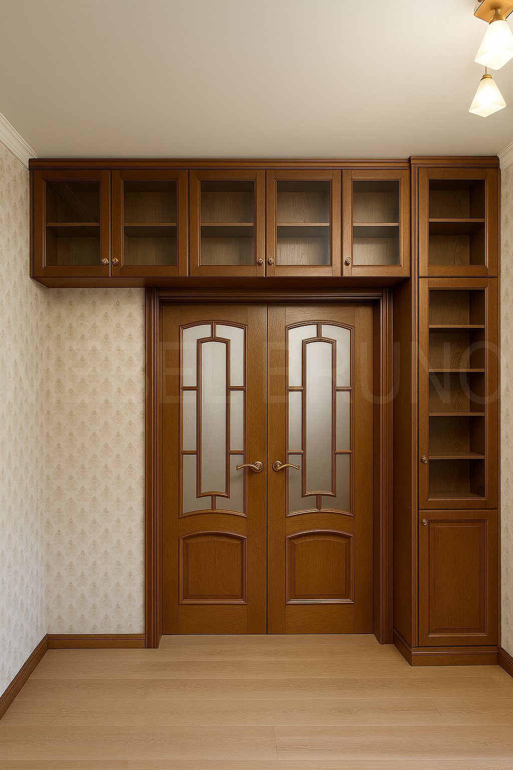 В этом проекте мы “забрали” в пользу хранения то пространство, которое обычно пустует — зону над дверным проёмом. Антресольные шкафы добавили объём, не утяжеляя интерьер, а боковой пенал со стеллажными полками сделал композицию завершённой и удобной в ежедневном использовании. Тёплая древесная отделка и классические пропорции позволяют мебели органично вписаться в интерьер и выглядеть как часть архитектуры помещения. Выполнено по индивидуальным размерам с точной подгонкой.