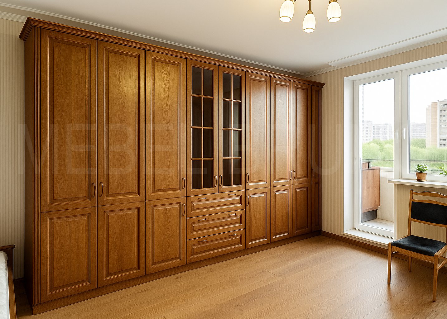 Когда нужно много хранения и при этом хочется “дорогой” классики — работает формат шкафа во всю стену. В этом проекте мы собрали единую композицию: закрытые секции для вещей, витринные фасады со стеклом и удобный блок ящиков для мелочей. Тёплая древесная отделка добавляет уюта, а ровная геометрия делает интерьер аккуратным и собранным. Всё выполнено по индивидуальным размерам с точной подгонкой и аккуратным монтажом.