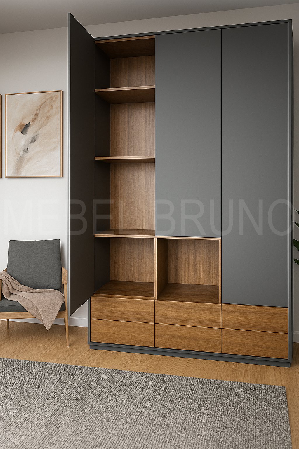 Этот проект — про современную функциональность без лишнего декора. Графитовые фасады делают композицию строгой и “дорогой”, а тёплое дерево в открытых нишах добавляет уюта и визуальной глубины. Мы совместили закрытое хранение и открытую витрину: книги, декор и аксессуары — на виду, а всё бытовое аккуратно уходит в ящики и закрытые секции. Шкаф выполнен по индивидуальным размерам, чтобы идеально встать в помещение и работать как часть интерьера.