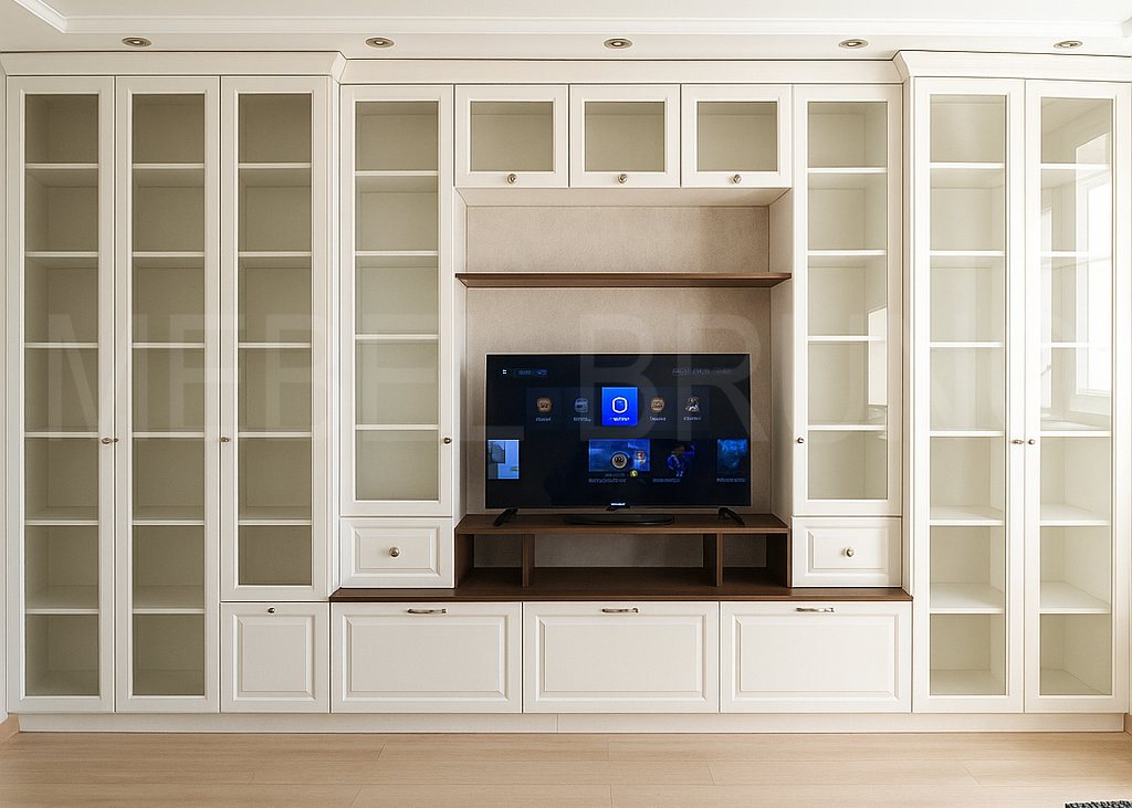 Эта стенка — решение “всё в одном” для гостиной: много красивых витрин, аккуратная ТВ-зона и продуманное хранение без визуального шума. Стеклянные секции делают композицию лёгкой, а светлая классика добавляет интерьеру ощущение простора и статуса. Центральная ниша собрана так, чтобы техника смотрелась аккуратно, а всё лишнее пряталось в закрытых модулях. Проект выполнен по индивидуальным размерам с точной подгонкой — мебель выглядит как часть архитектуры комнаты.