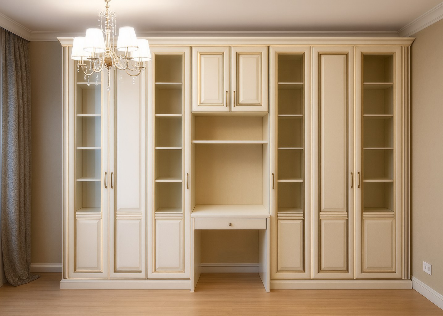 Классическая встроенная мебельная композиция с рабочей зоной, выполненная по индивидуальному проекту.