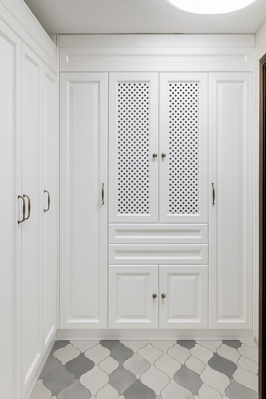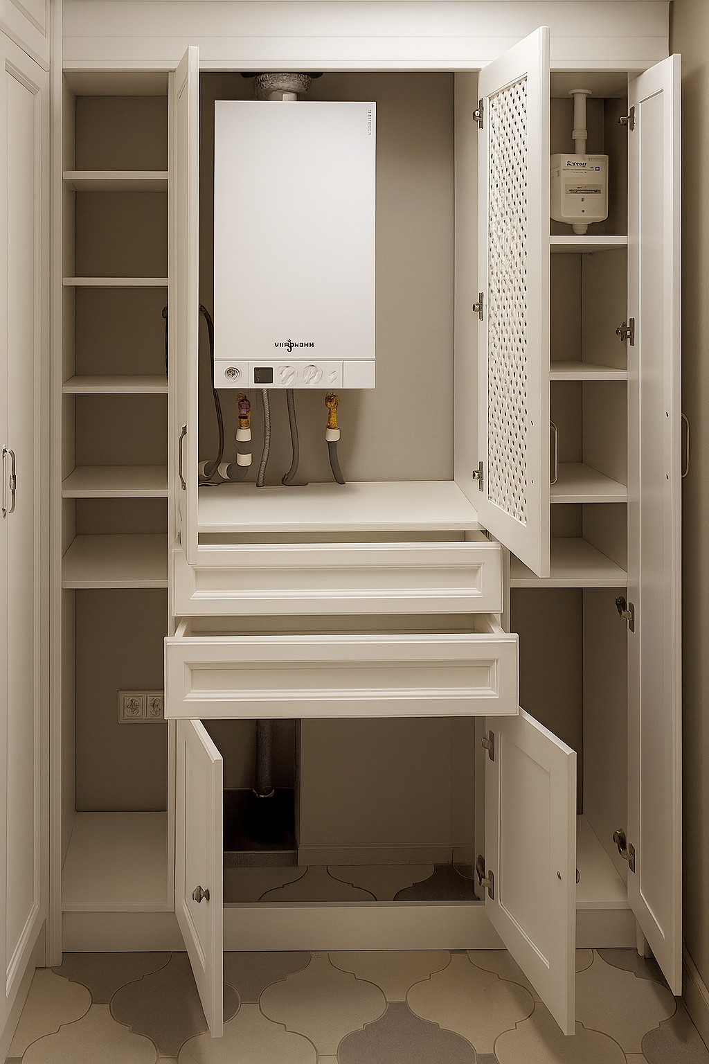 Встроенный технический шкаф для газового оборудования, выполнен в неоклассическом стиле с акцентом на симметрию и декоративные элементы.