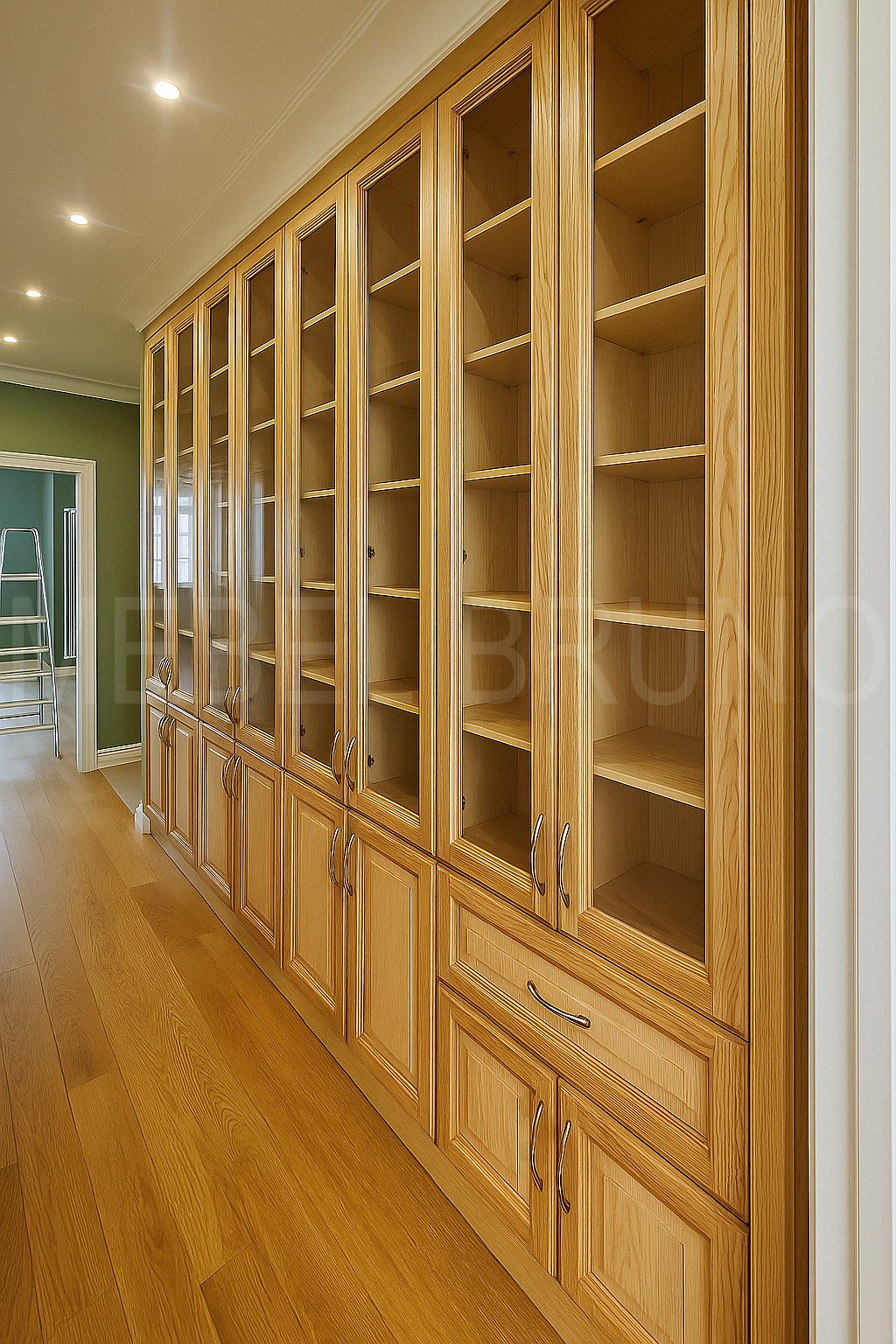 Эта библиотека — пример “большого” проекта, который делает интерьер завершённым. Стеклянные витринные секции визуально облегчают масштаб, а тёплая древесная отделка добавляет уюта и статуса. Полки рассчитаны под книги и коллекции, а нижние модули и ящики берут на себя всё хранение, которое лучше скрыть. Проект выполнен по индивидуальным размерам с точной подгонкой — библиотека выглядит как часть архитектуры комнаты и служит годами.
