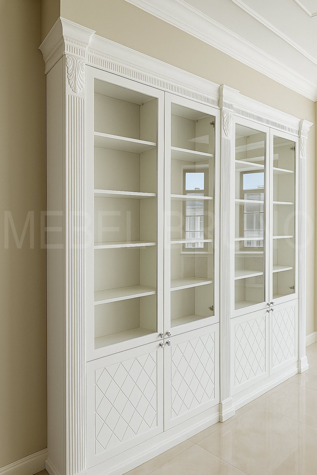Эта библиотека-витрина — про свет, порядок и статусную классику. Стеклянные фасады делают композицию визуально лёгкой, а декоративные пилястры и карниз придают интерьеру “архитектурность” и завершённость. Нижние секции прячут всё бытовое, оставляя на виду только книги и декор. Выполнили по индивидуальным размерам с точной подгонкой, чтобы мебель выглядела как часть пространства, а не отдельный предмет.