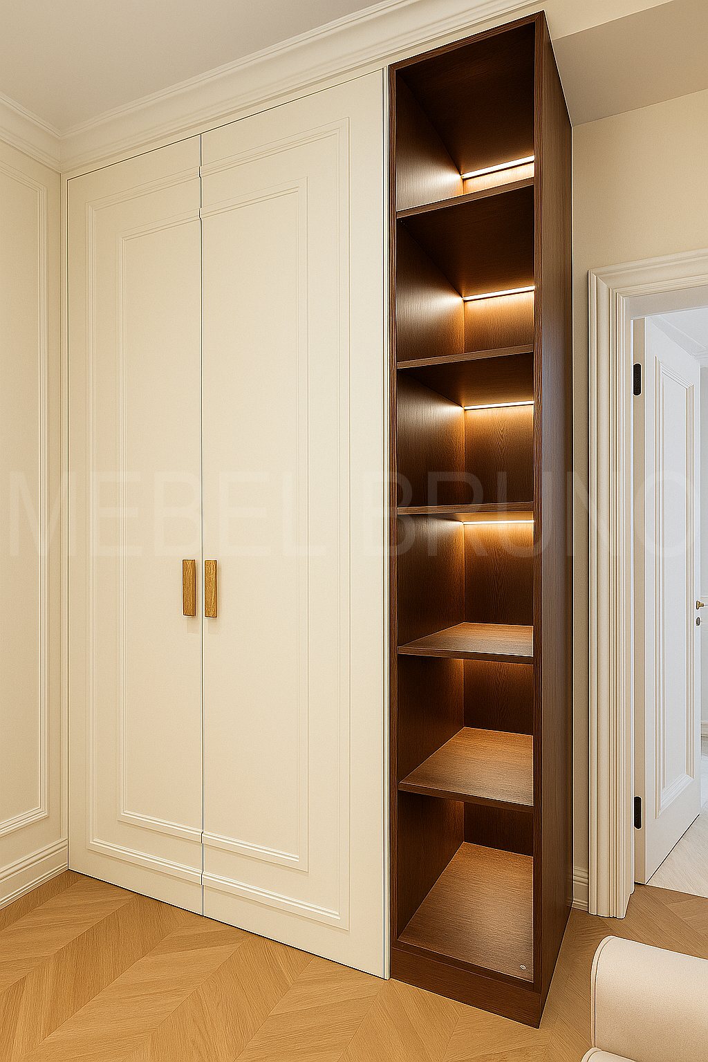 Этот проект — про баланс практичности и “вау-детали”. Светлый шкаф аккуратно растворяется в интерьере и даёт максимум закрытого хранения, а боковой стеллаж под дерево с подсветкой становится тёплым акцентом и красивой витриной для декора. Подсветка добавляет уютный вечерний сценарий, а контраст материалов делает композицию более дорогой визуально. Всё изготовлено по индивидуальным размерам с точной подгонкой и чистым монтажом.