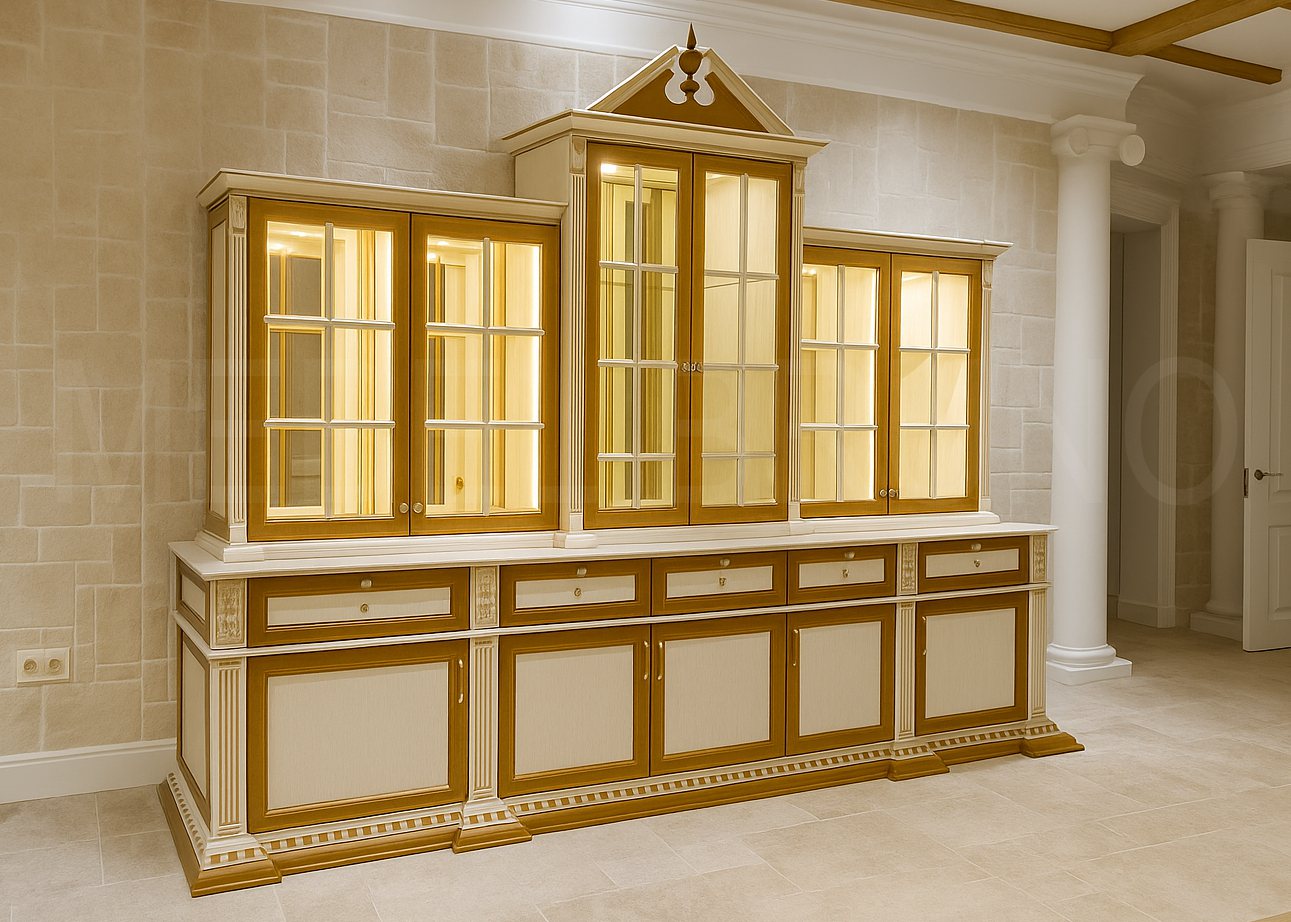 Этот буфет-витрина создан для тех, кто любит порядок и красивые детали. Витринные секции со стеклом и подсветкой превращают посуду и коллекции в часть декора, а нижние модули берут на себя всё хранение “без лишнего на виду”. Классические пропорции, аккуратный декор и тёплый свет делают композицию по-настоящему статусной. Проект выполнен по индивидуальным размерам и установлен “под ключ” — точно, чисто и надолго.