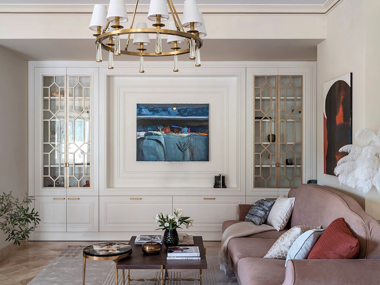 Подробное описание: Композиция объединяет две высокие витрины с изящной геометрической решёткой и центральную архитектурную панель. Ниша рассчитана на телевизор или картину; нижние тумбы добавляют закрытое хранение. Классические пропорции, тонкие латунные акценты и светлая эмаль делают систему лёгкой и торжественной. Конфигурация, цвет и рисунок раскладки могут быть адаптированы под ваш интерьер.