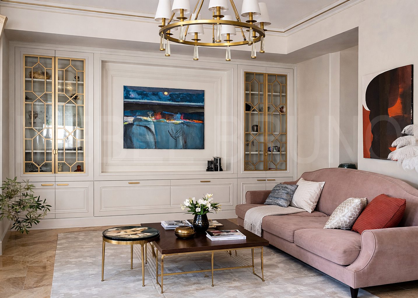 Элементы декора: Фигурный короновый карниз, широкие пилястры, глухие панели в центре (под ТВ/панно), цоколь; утопленные латунные ручки