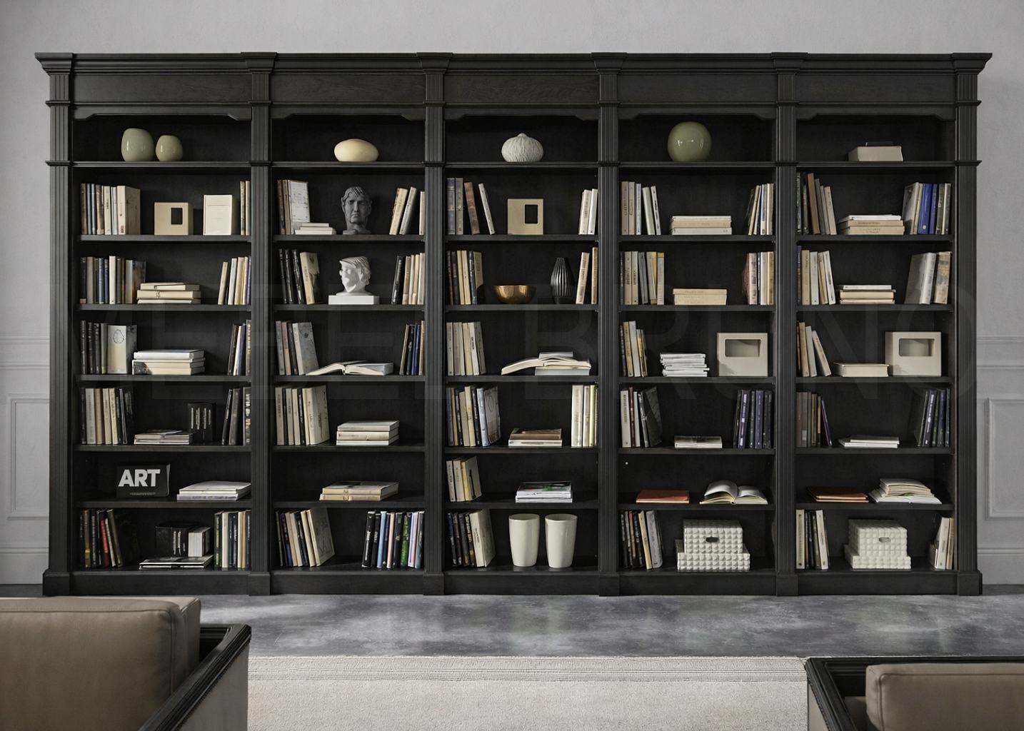 Подробное описание: Статусная библиотека во всю стену в насыщенном графитовом цвете создаёт эффект «домашней галереи» и подчёркивает коллекцию книг. Открытые полки обеспечивают быстрый доступ и гибкость хранения, а классический карниз и стойки добавляют архитектурную выразительность. Композиция модульная и легко адаптируется под ширину стены, высоту потолка и требуемую вместимость.