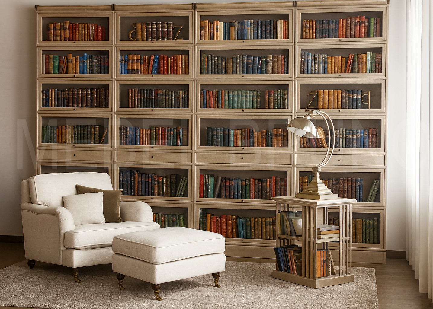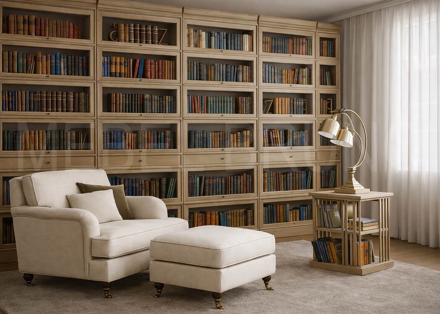 Подробное описание: Модульная библиотека в светлой бежевой отделке выполнена в стиле «barrister bookcase»: каждая горизонтальная секция имеет собственную витринную дверь со стеклом, что защищает книги от пыли и подчёркивает аккуратную «полочную» графику. Узкие рамки и лаконичный карниз создают благородный классический образ, а равномерная сетка секций обеспечивает высокую вместимость и порядок на стене. Композиция легко адаптируется под вашу нишу или габариты комнаты — от небольшого читального уголка до полноценной стенки вдоль всей стены.
