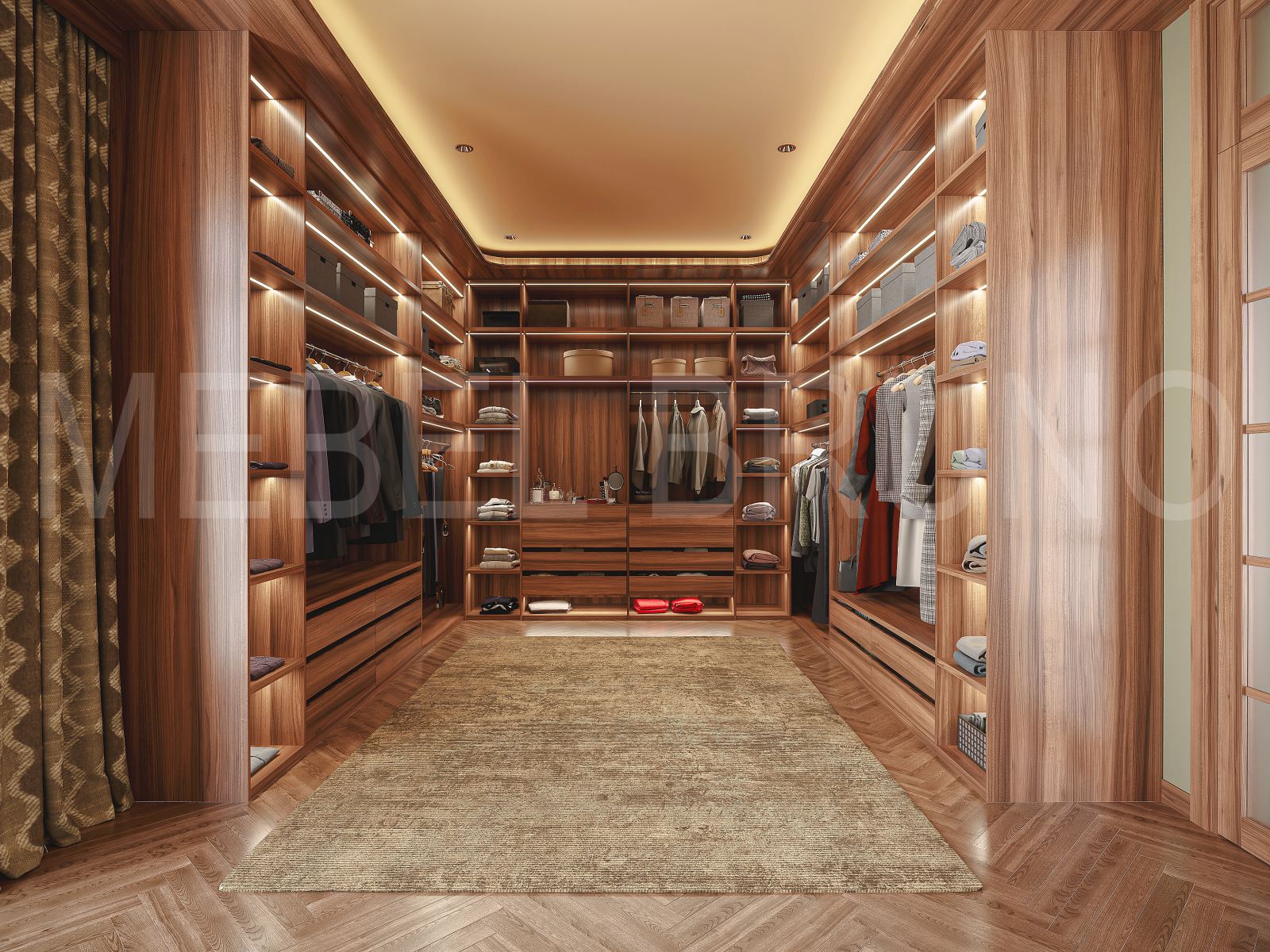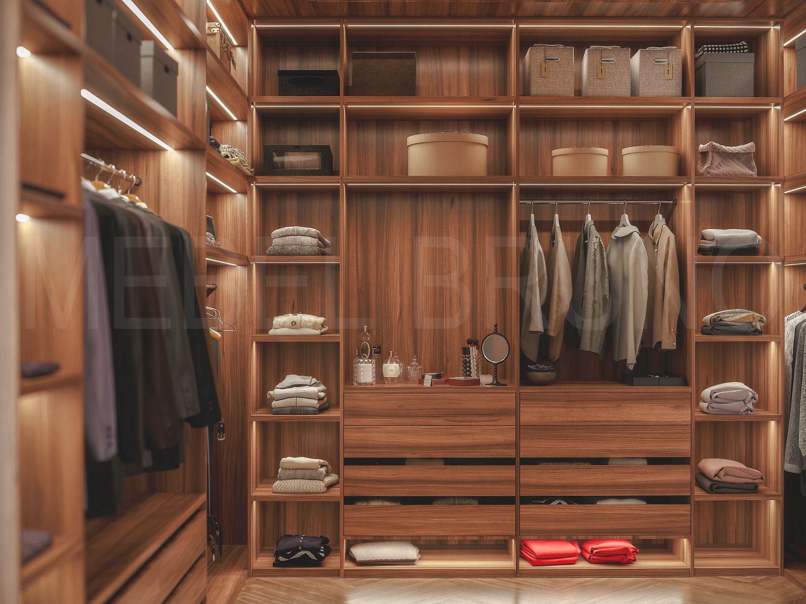 Комплектация: Встроенная гардеробная с открытыми вешалками и полками и выдвижными ящиками