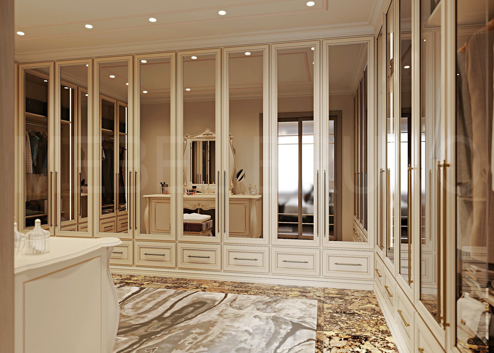 Комплектация: Встроенная гардеробная с открытыми полками и выдвижными ящиками, двери купе с зеркалами при входе в гардеробную..