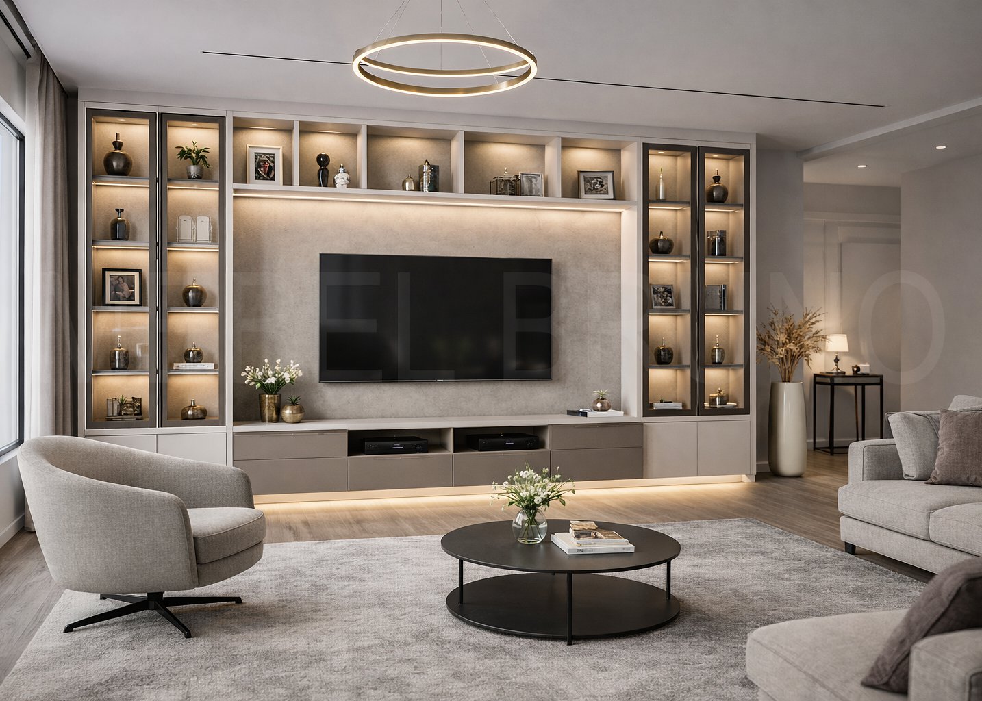 Элементы декора: Арочные акцентные панели на витринах, вертикальные каннелюры/рифление, латунные ручки, подсветка ниш и полок, декоративная центральная панель под ТВ.