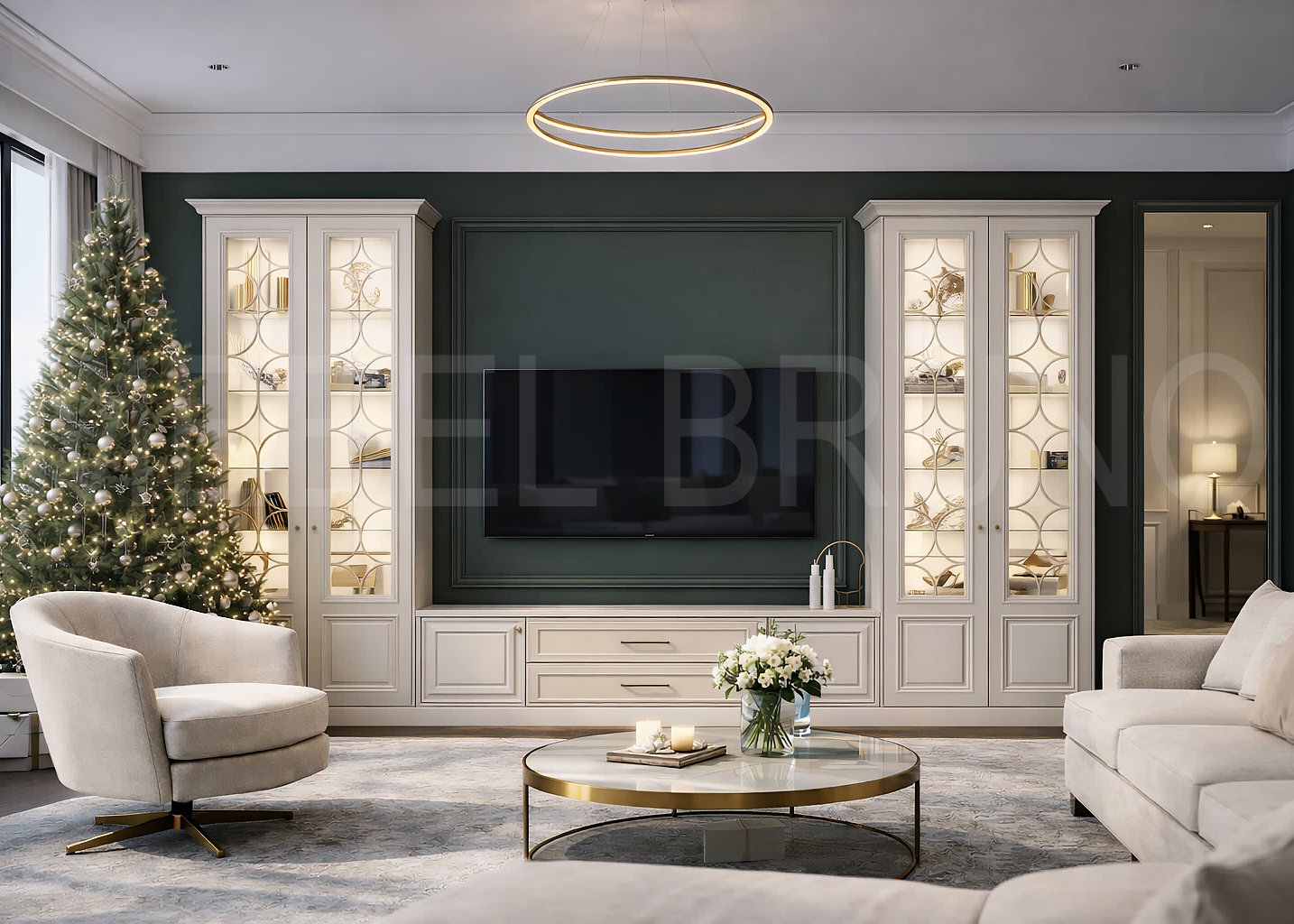 Подробное описание: Светлая ТВ-композиция в стиле современной классики объединяет две витрины с подсветкой и центральный модуль под телевизор. Витринные секции подчёркивают сервировку и декор, а нижняя тумба скрывает технику и повседневные вещи. Модель гармонично смотрится в интерьерах неоклассика/modern classic и адаптируется под ширину стены и диагональ ТВ.