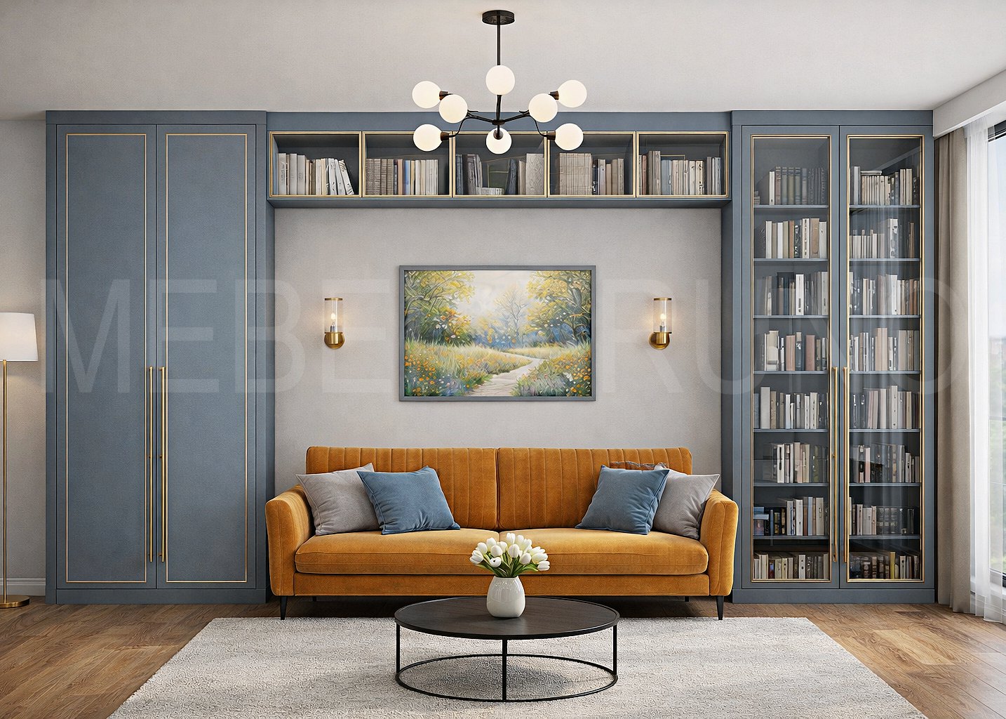 Назначение: Для хранения книг, декора и организации зоны гостиной