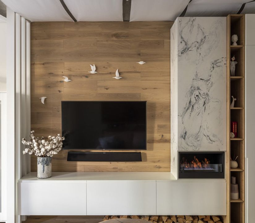 Комплектация: Мебельная стенка для гостинной с интегрированным биокамином, стеновые панели.