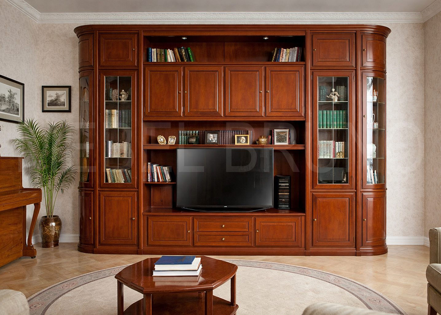 Количество дверей и ящиков: Две витрины с остеклёнными дверцами, нижние тумбы с глухими фасадами, открытые полки по центру; конфигурация модулей может адаптироваться под размеры комнаты.