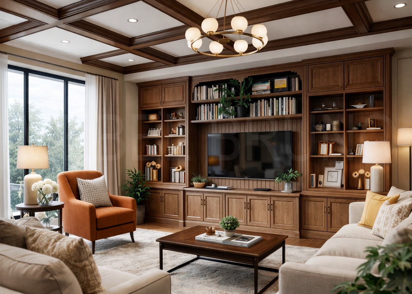 Подробное описание: ТВ-стенка-библиотека в тёплом дереве объединяет вместительное хранение и аккуратную медиа-зону. Центральная панель подчёркивает телевизор, боковые открытые секции подходят для книг и декора, а верхние антресоли добавляют объём хранения без перегруза интерьера. Нижние тумбы скрывают повседневные вещи и технику. Проект легко адаптируется под размеры стены, диагональ ТВ и нужный функционал.