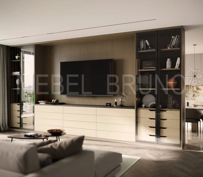 Тип расположения: Пристенная ТВ-зона с модульной системой хранения. Центральный блок — ниша под ТВ; боковые секции — витрины и открытые полки.