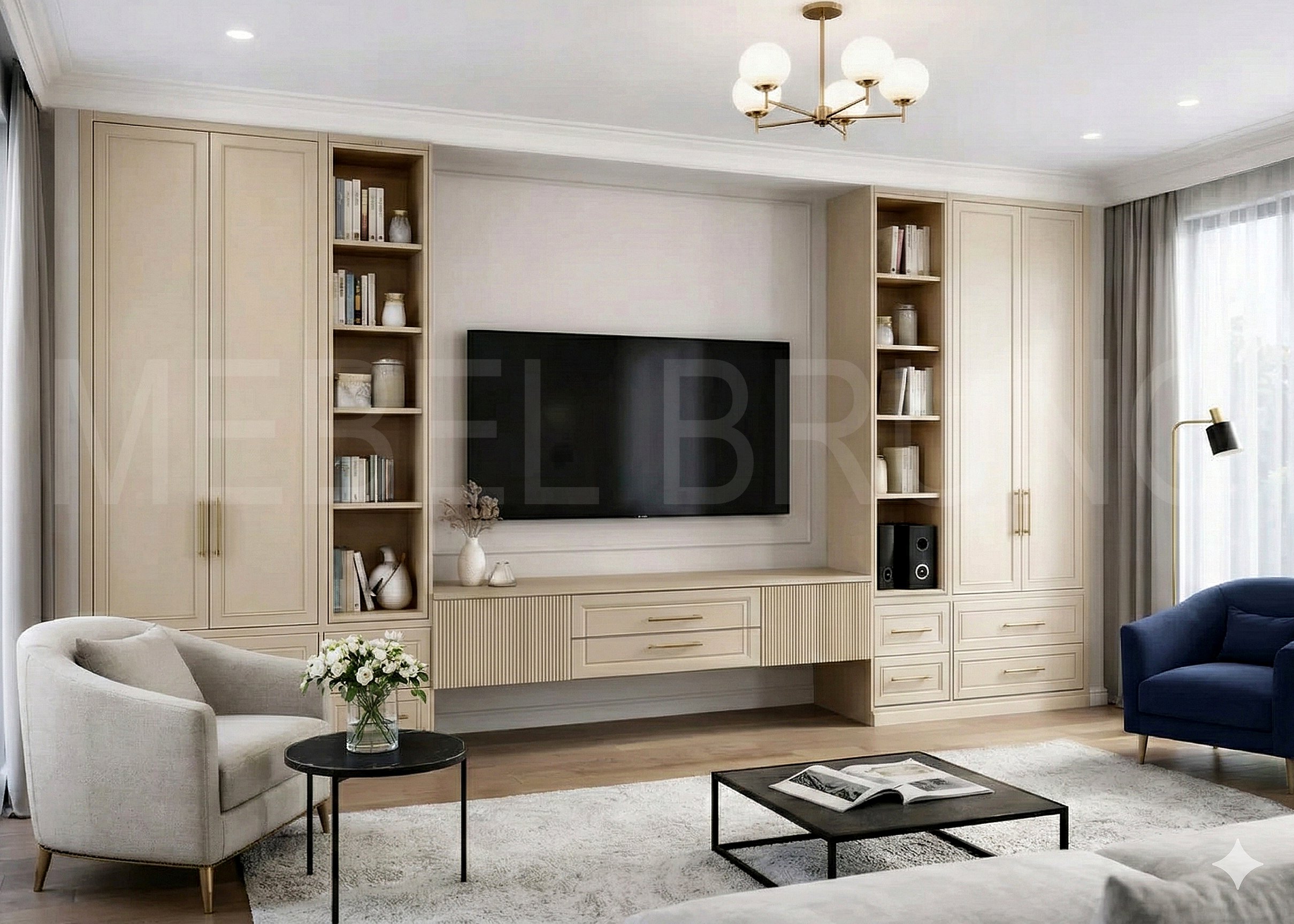 Подробное описание: Светлая ТВ-композиция в стиле современной классики объединяет закрытые шкафы для хранения и открытые стеллажи для книг и декора. Центральная зона подчёркивает телевизор и обеспечивает удобное размещение техники, а ящики и тумбы скрывают повседневные вещи. Латунные акценты и рифлёные элементы добавляют интерьеру статусности. Модель адаптируется под ширину стены, диагональ ТВ и нужный объём хранения.