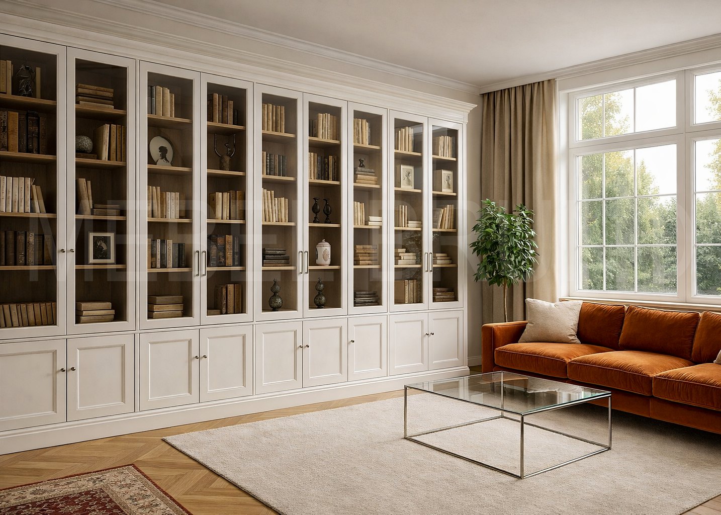 Подробное описание: Большая классическая библиотека с остеклёнными дверями по всей высоте и базовыми тумбами внизу создаёт светлую, лёгкую композицию. Тёплая древесная внутренняя отделка подчёркивает корешки книг и предметы декора, а аккуратный карниз и филёнки придают системе архитектурность. Модульная конструкция позволяет масштабировать длину, количество секций и формат хранения под размеры вашей комнаты и сценарии использования.