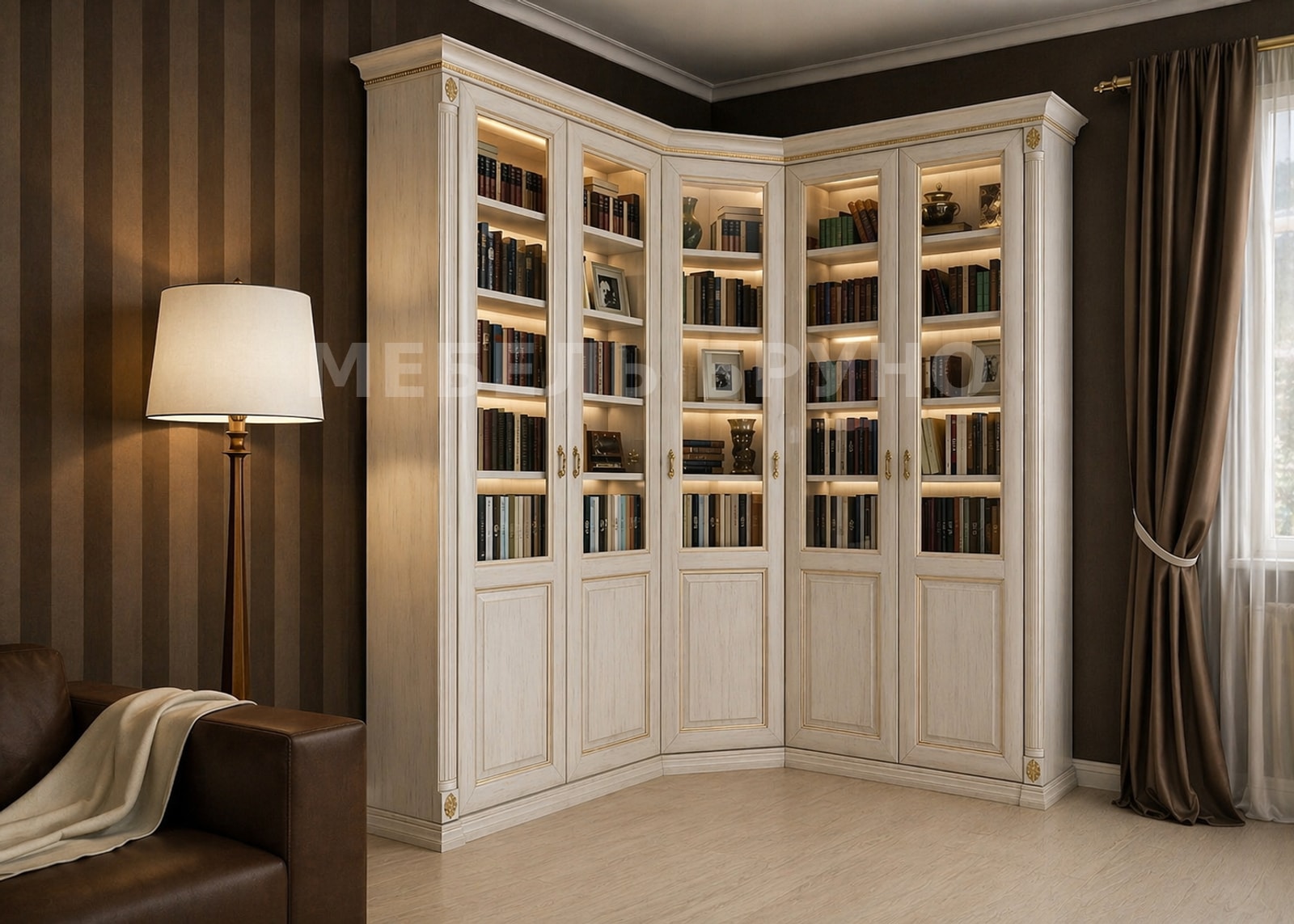 Подробное описание: Элегантный угловой книжный шкаф в классическом стиле образует цельную библиотечную композицию вдоль двух стен. Витринные двери со стеклянными створками защищают книги от пыли и визуально «облегчают» объём, а нижние филёнки придают фасадам графичность. Карниз, каннелированные пилястры и деликатная золотая патина подчёркивают архитектурность и статус интерьера. Решение идеально для кабинета или гостиной, легко адаптируется под помещение и ваши задачи по хранению.