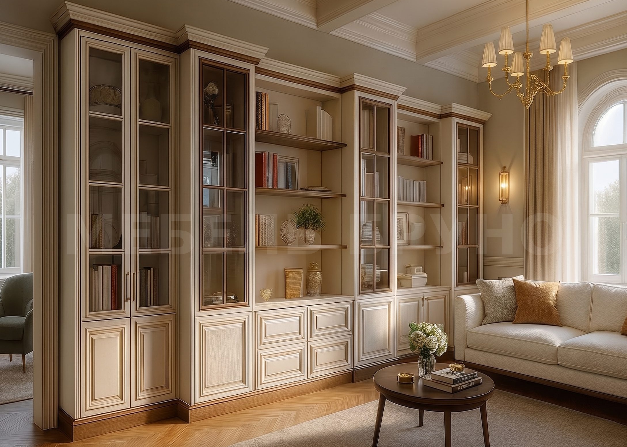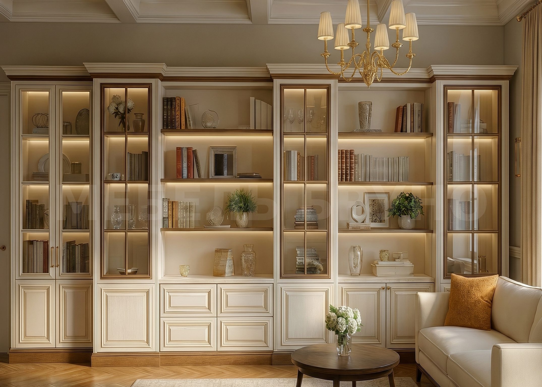Подробное описание: Лаконичная классическая библиотека сочетает закрытые витрины и удобные открытые ниши — книги и декор красиво демонстрируются и при этом защищены от пыли. Светлая эмаль с деликатной патиной подчёркивает фигурные карнизы и филёнки, а полки «под дуб» добавляют интерьеру тепла. Нижний модуль с закрытыми секциями и ящиками подходит для хранения документов и мелочей. Система проектируется под ваш проём и высоту потолка, легко масштабируется по длине и наполняемости, а также может оснащаться подсветкой для мягкого вечернего света.