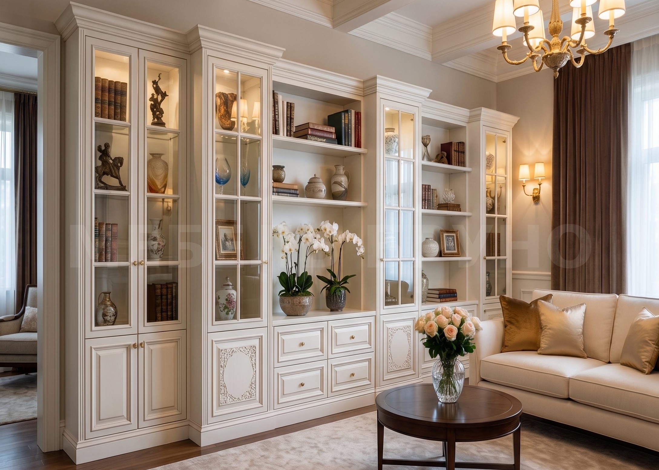 Элементы декора: Классические карнизы и цоколь, филёнки, тонкие переплёты на стекле, ручки в тёплом металле