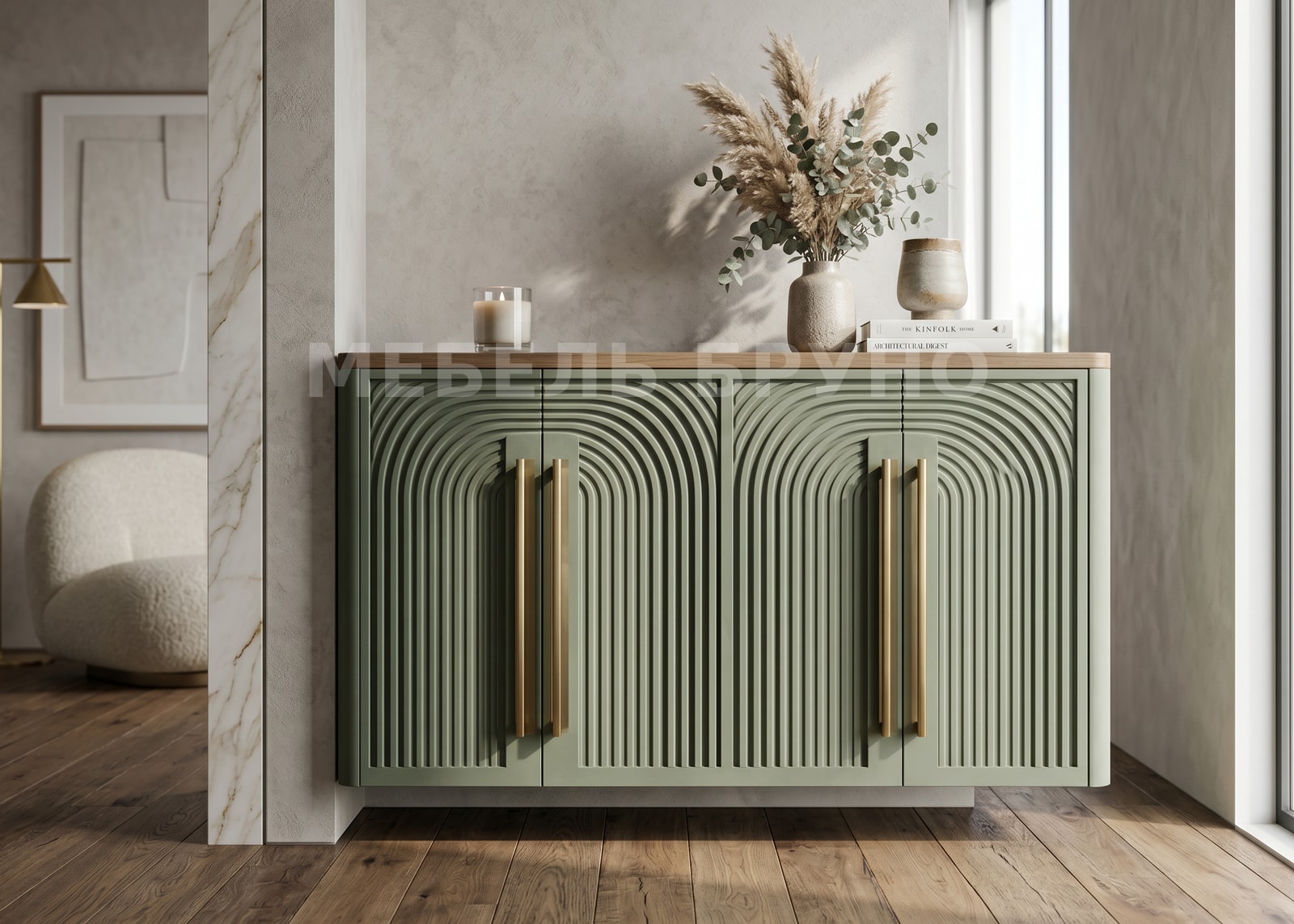 Эта модель шкафа идеально вписывается в современный интерьер. Фрезеровка на фасадах придаёт мебели стильный и уникальный вид. Зелёный цвет добавляет свежести и гармонии в пространство.