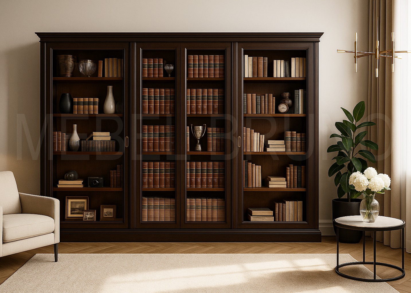 Подробное описание: Книжный шкаф-витрина с тремя раздвижными стеклянными фасадами экономит место перед мебелью и обеспечивает удобный доступ к полкам. Тёмный корпус подчёркивает тёплую древесную отделку внутри, а прозрачные витрины делают коллекцию книг и декора частью интерьера. Широкие полки выдерживают нагрузку, а аккуратный цоколь и коронный карниз формируют благородный классический силуэт. Модель изготавливается на заказ и легко настраивается по размерам, конфигурации секций и компоновке полок.