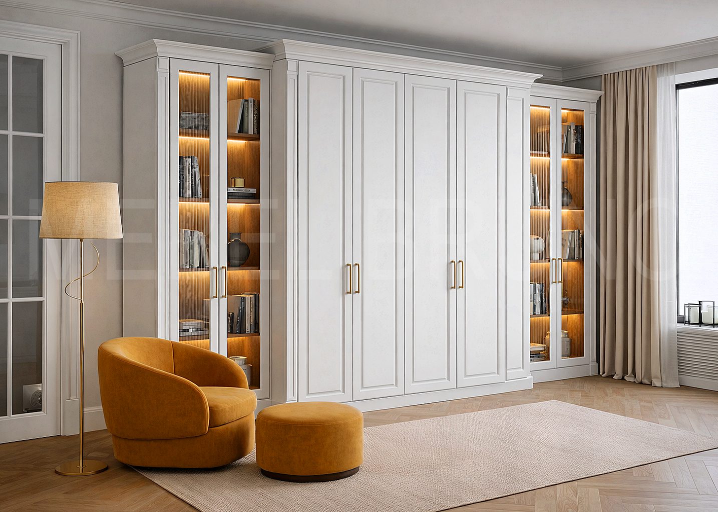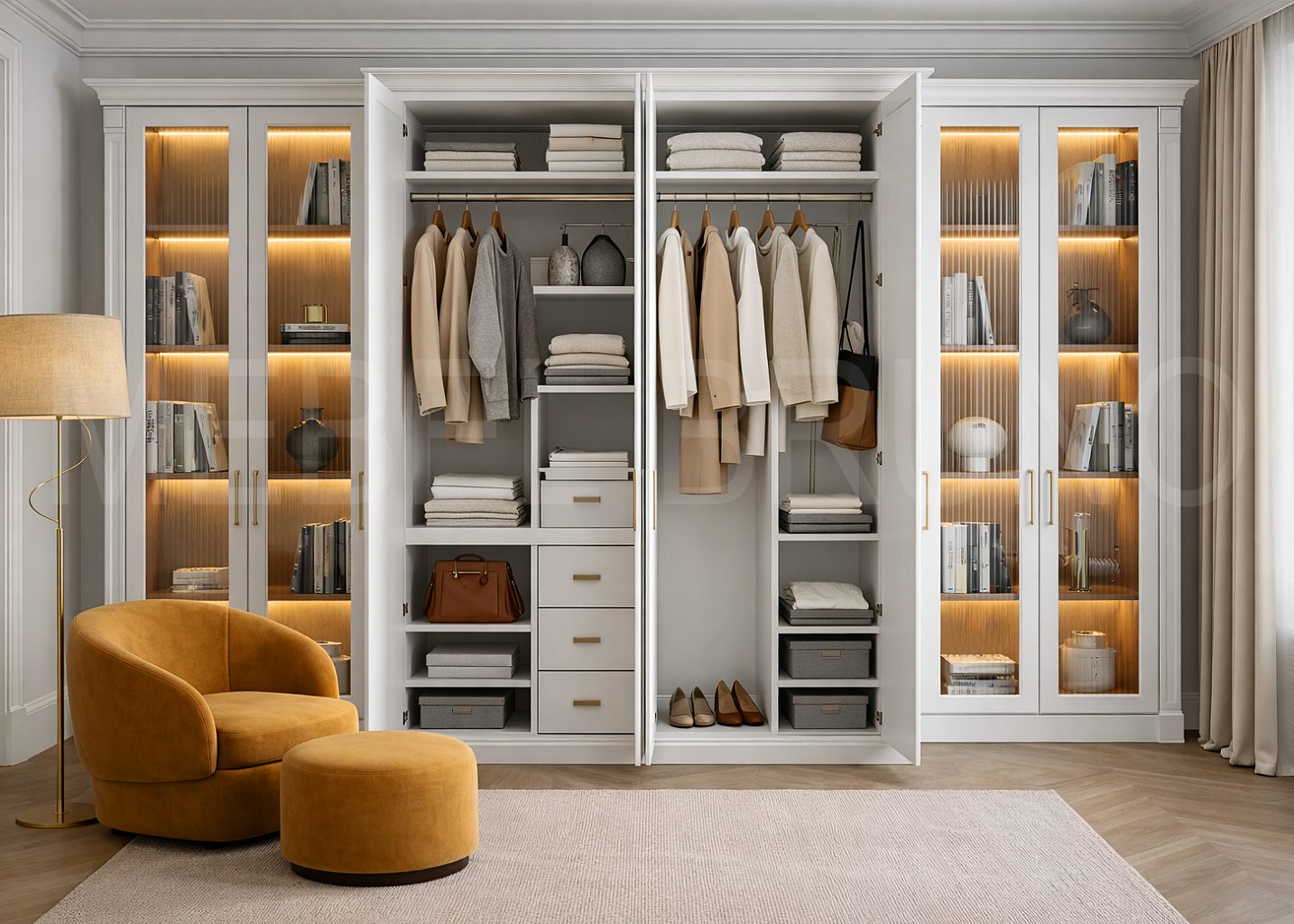 Освещение и функционал: Опция — встроенная LED-подсветка внутренних полок и секций; кабель-каналы для встроенных систем освещения.