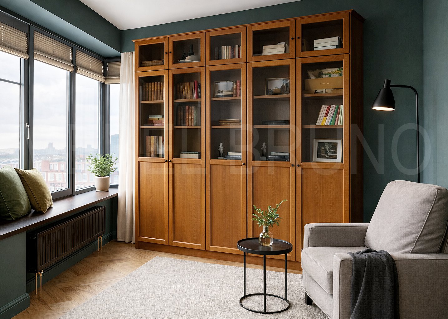 Дополнительно: Предусмотрена возможность изготовления шкафа для книг по индивидуальным размерам; стандартные габариты, конфигурация секций и материалы отделки могут быть изменены по желанию клиента