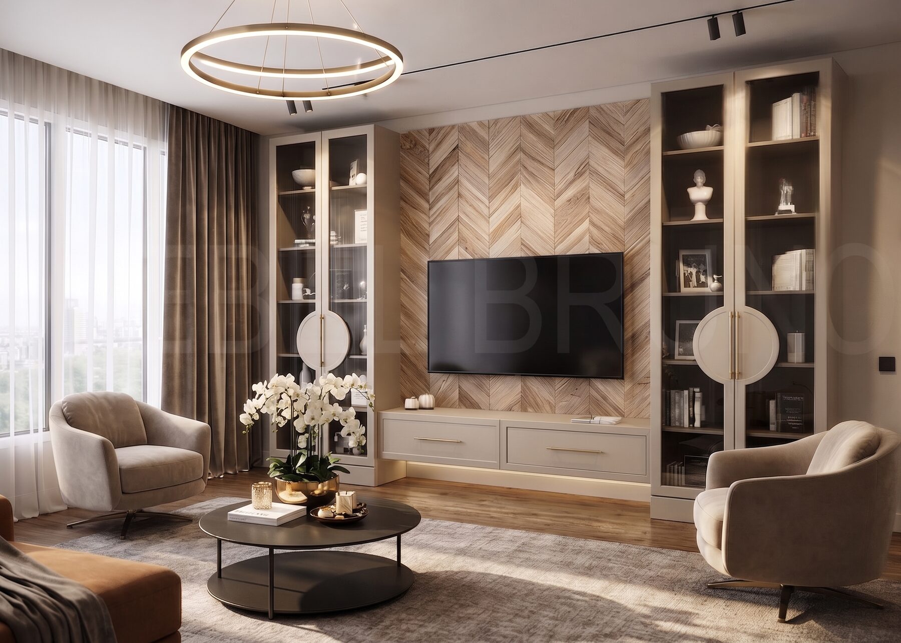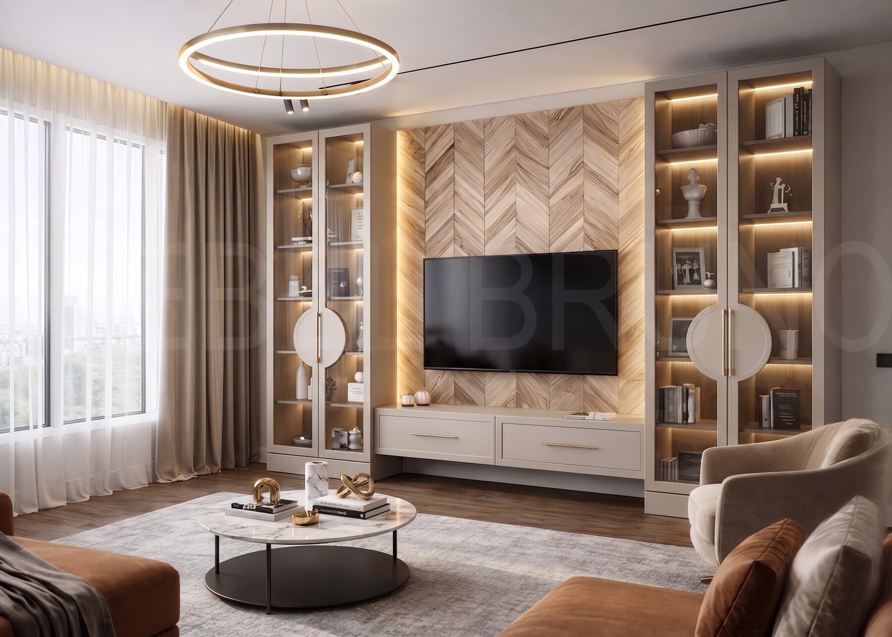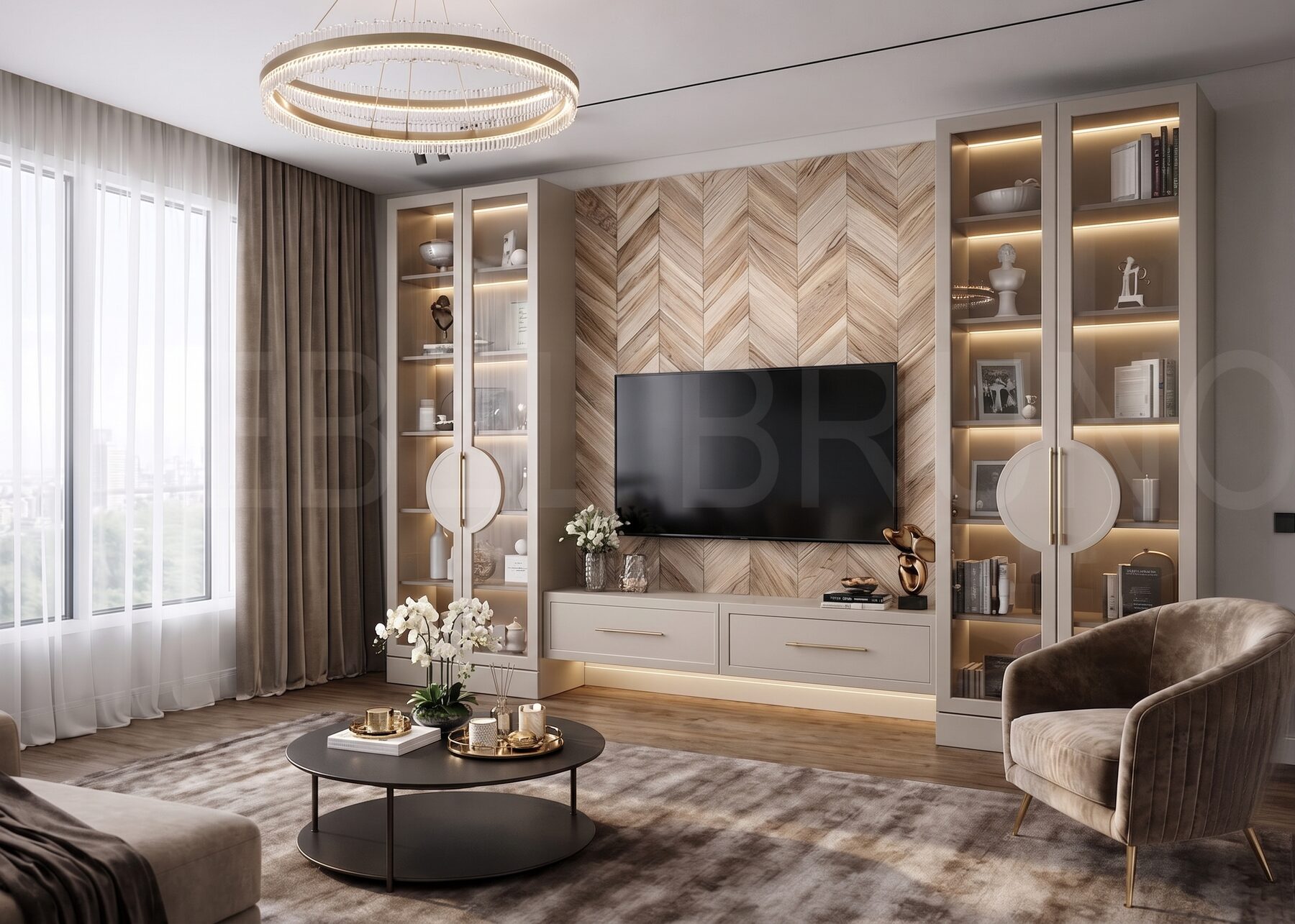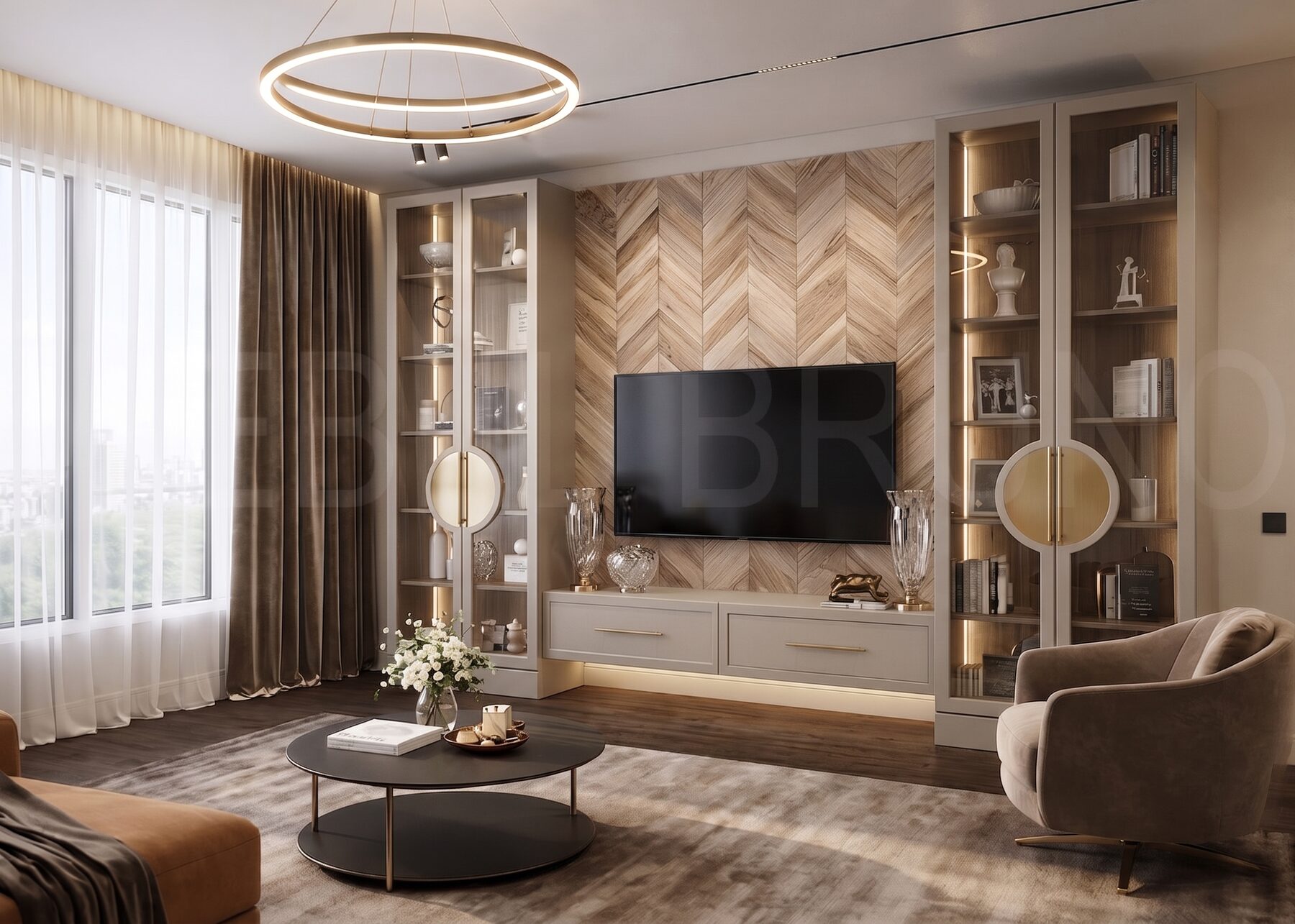 Элементы декора: Акцентная панель «ёлочка» под ТВ, витринные секции с подсветкой, латунные ручки и декоративные круглые элементы на фасадах, подвесная тумба.