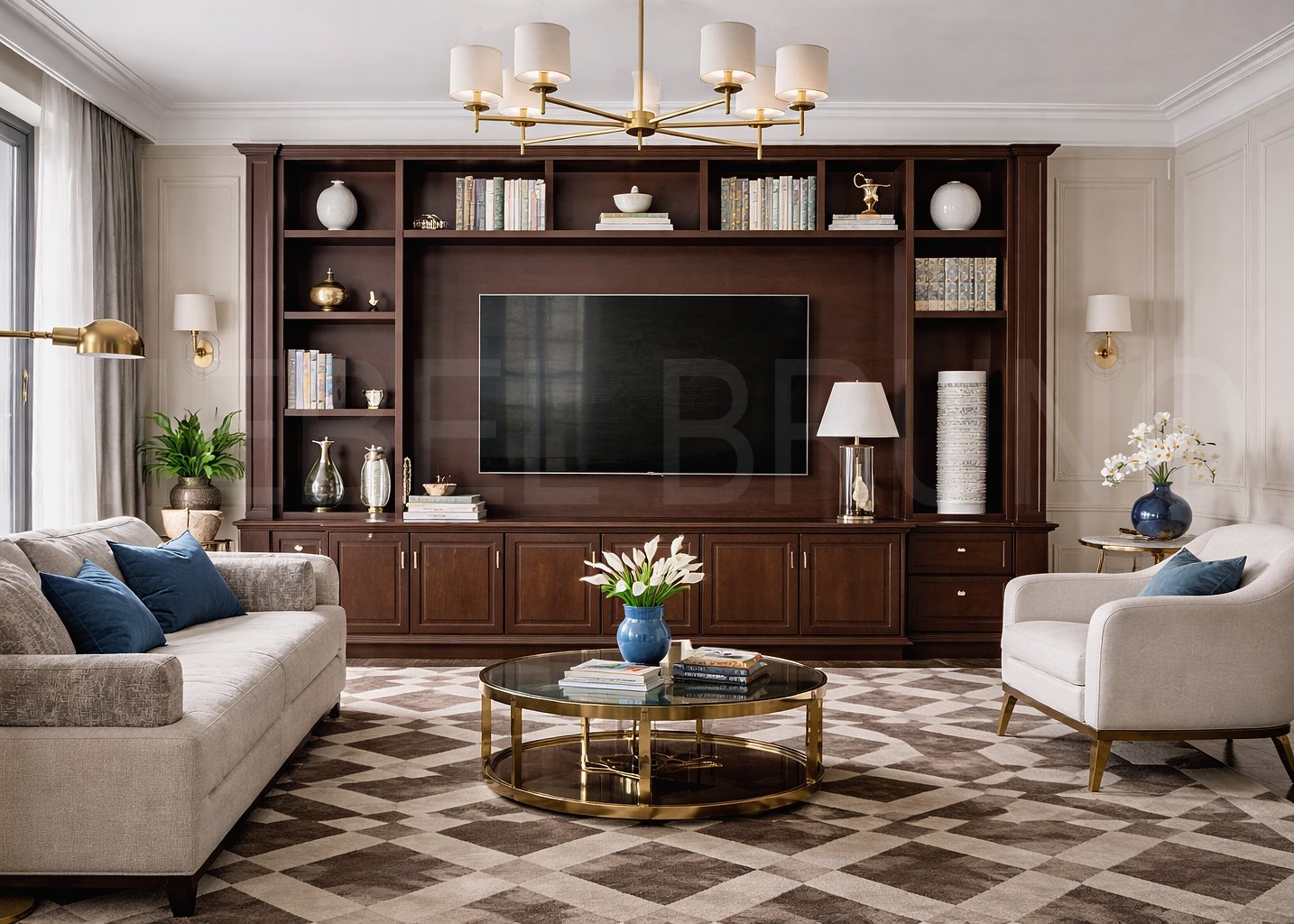 Подробное описание: Элегантная ТВ-стенка в стиле современной классики выполнена в тёплом ореховом тоне и сочетает закрытое хранение с открытыми библиотечными секциями. Центральная панель подчёркивает телевизор, верхний ряд полок подходит для книг и декора, а нижние тумбы скрывают повседневные вещи и технику. Композиция легко адаптируется под ширину стены, диагональ ТВ и нужный объём хранения.